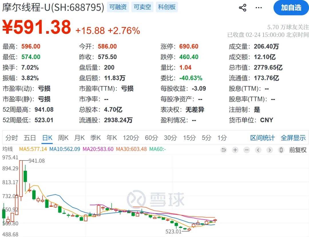 自2025年12月5号以114.28的发行价上市后,摩尔线倍的涨幅。散户如果中签没卖的线多万,堪比买彩票。